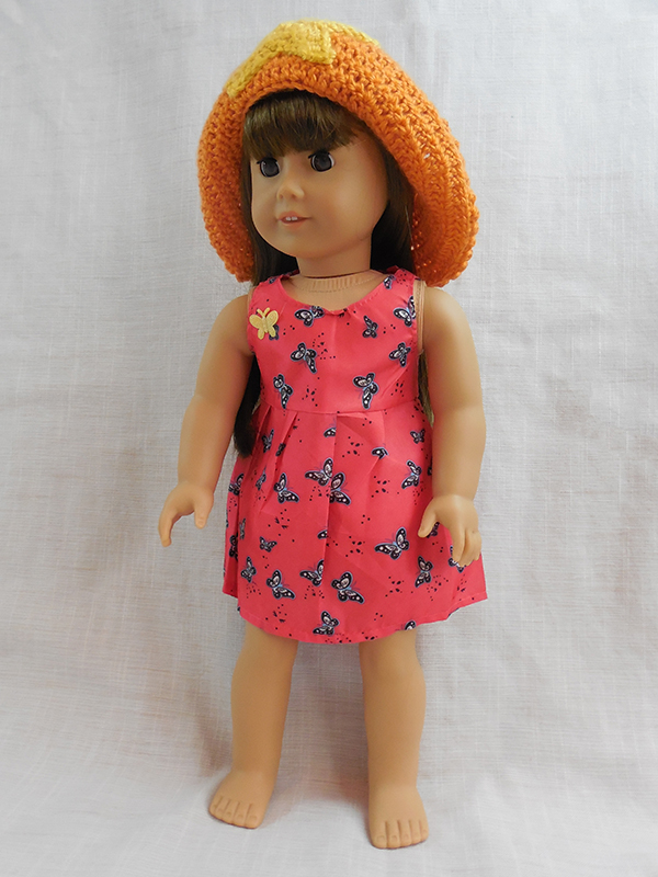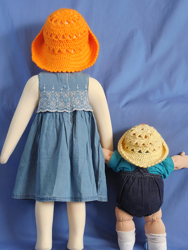All models for size NB to 12 months were created using soft worsted weight yarn and a size G (4.25mm) crochet hook. The American Girl hat was created using DK weight acrylic yarn and a size E (3.50 mm) crochet hook.