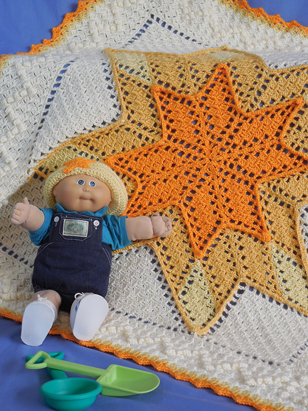 This bright and sunny set includes the August Sun Afghan, the cute Fun-in-the-Sun Hat with starfish applique sized for your newborn to 12 month old, and the Starfish Tote Bag to carry all your beach toys. All models incorporate a corner-to-corner style technique to create the design. This set is eighth in a series of baby afghan sets using a hybrid of corner-to-corner and filet crochet techniques, with popcorn stitches added to enhance the design. Instructions are also included to make the Fun-in-the Sun Hat for your American Girl doll!