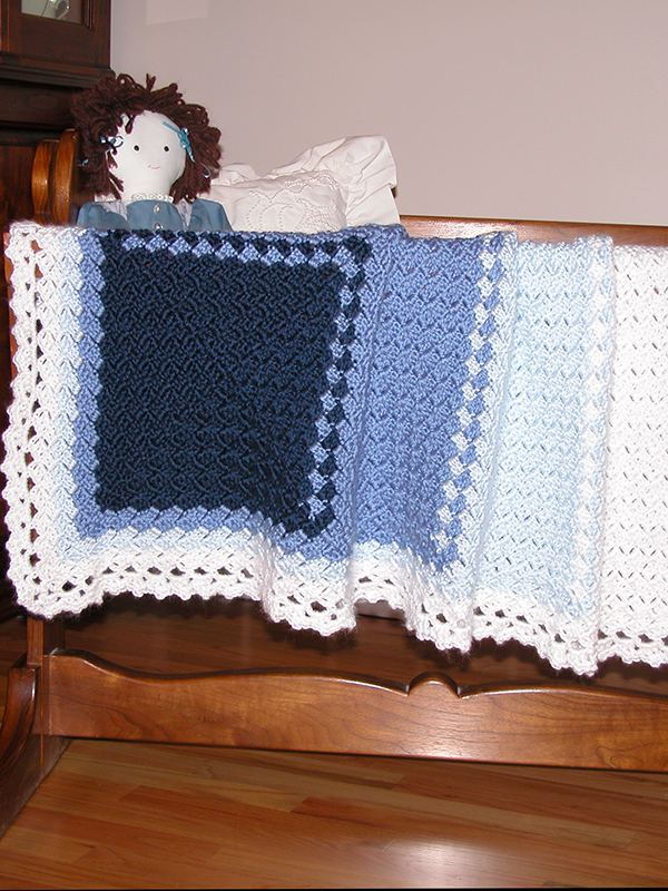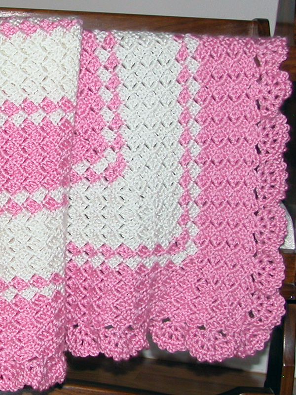 The "pink diamond" afghan alternates evenly between pink and white diamonds, while the "blue diamond" afghan graduates from dark blue to white radiating from one corner in progressively larger diamonds. Petite and lacy border options are provided for either afghan.