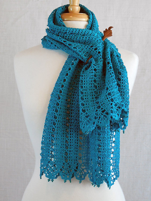 The model was created with teal crochet cotton, size 10, and a size 7 (1.65 mm) steel crochet hook. Teal 6/0 seed beads are incorporated throughout the shawl.