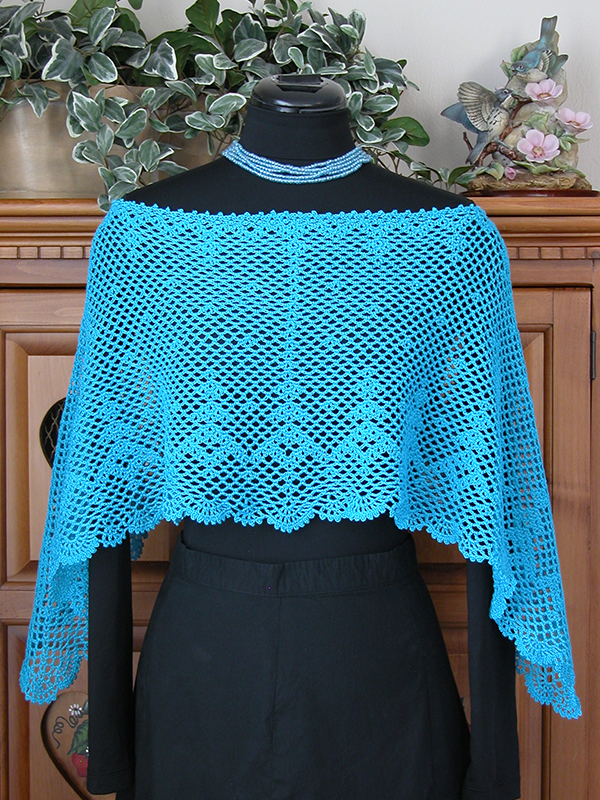 This versatile cape makes a great coverup for a summer outfit or adds a touch of color to a winter outfit. It can be worn as a traditional poncho or even turned and worn sideways. Two border styles, a lacy scalloped border and a beaded fringe border, are provided to create different looks. Instructions are also provided for a smaller neck opening, if desired, and detailed graphs are included for reference.