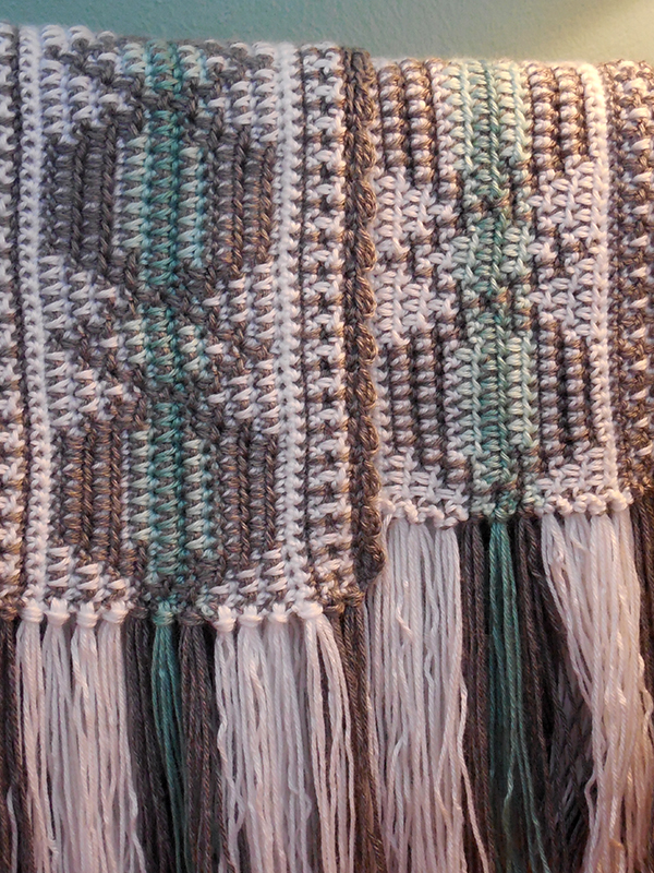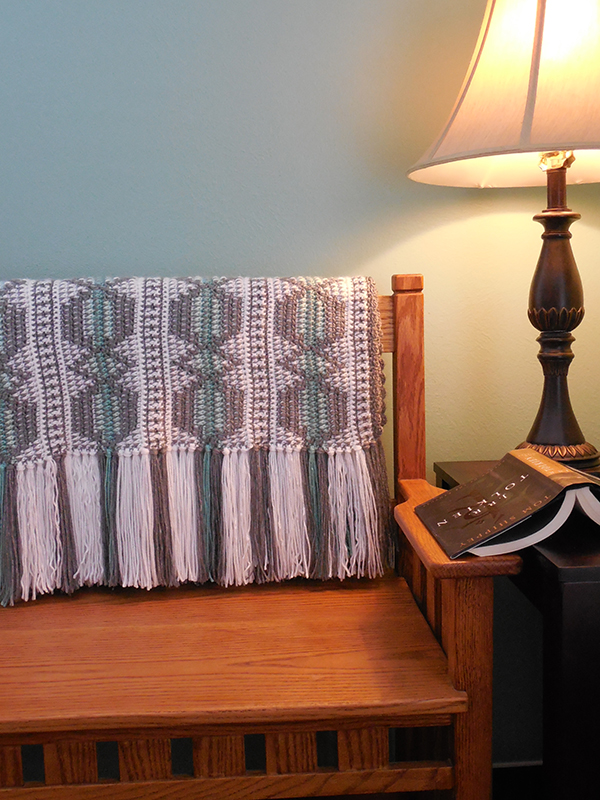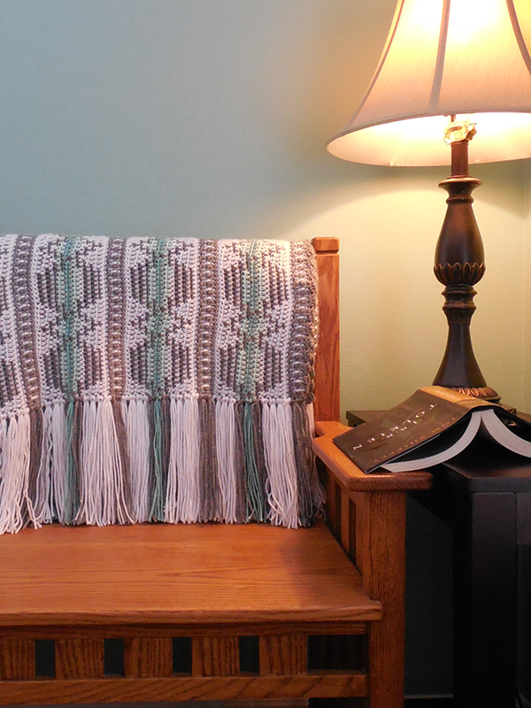 Snuggle up for cold weather in the calm colors of the Chained Melody reversible afghan! This reversible technique alternates rows of grey with white and two shades of green. It's not as complicated as it looks (check out the Free Patterns page for patterns to try out this technique)!