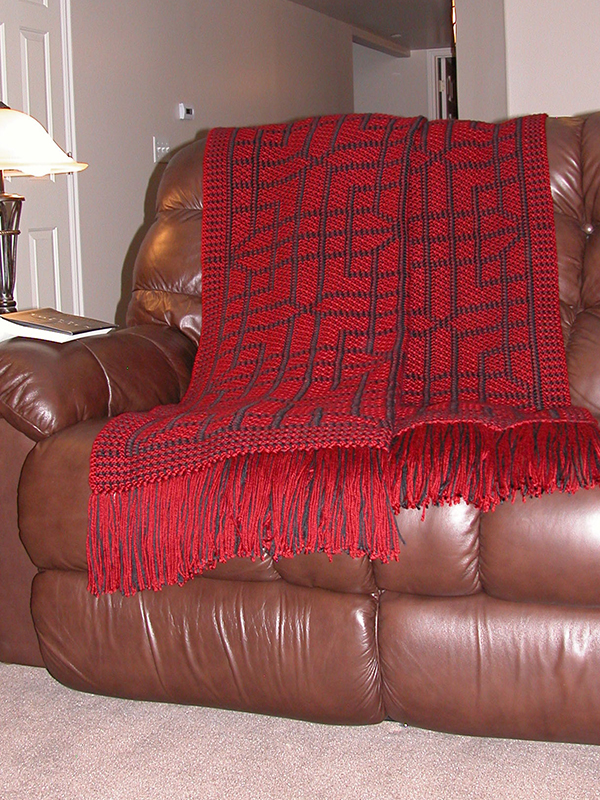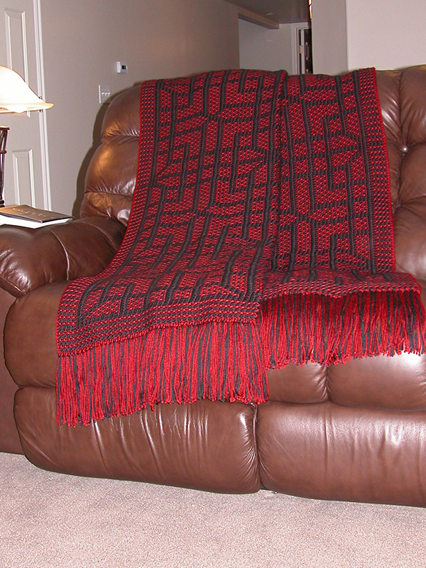 This bold geometric design will add warmth to any room. This reversible technique alternates rows of red and black making one color more prominent on each side. It's not as complicated as it looks (check out the Free Patterns page for patterns to try out this technique)!