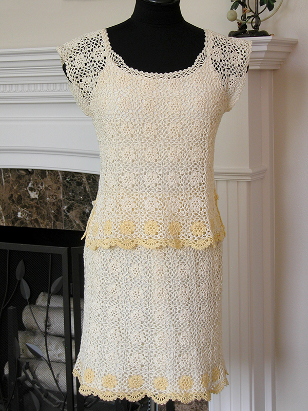 Dress up in this Classic Summer Set, which also includes a matching hat*, or wear the pieces as separates for more wardrobe options. The top has a lacy neckline and buttoned slits on each side. The skirt has a buttoned slit in the back and also buttons in the back. All motifs are connected with a join-as-you-go method.