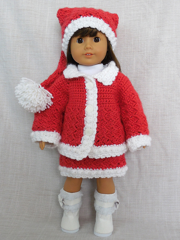 All models for size NB to 12 months were created using soft worsted weight yarn and size G (4.25 mm) and H (5.00 mm) crochet hooks. The American Girl outfit was created using DK weight acrylic yarn and size E (3.50 mm) and F (3.75 mm) crochet hooks.