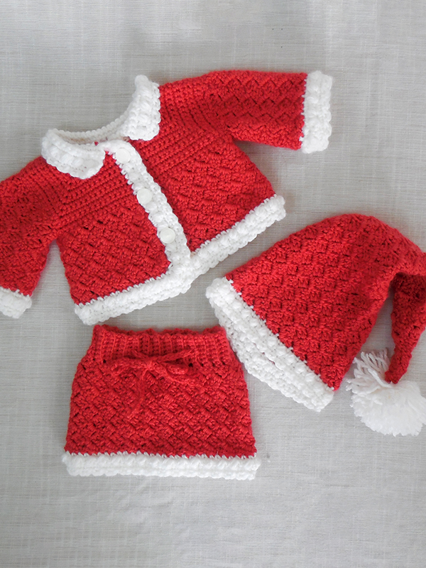 This festive set includes the Christmas Tree Afghan with a tesselation of positive and negative Christmas trees and a border reminescent of cranberry and popcorn gardlands; a Holiday Jacket and Skirt, and an Elf Hat, sized for your newborn to 12 month old. All models incorporate a corner-to-corner style technique to create the design. This set is twelfth in a series of baby afghan sets using a hybrid of corner-to-corner and filet crochet techniques, with popcorn stitches added to enhance the design. Instructions are also included to make this holiday outfit for your American Girl doll!