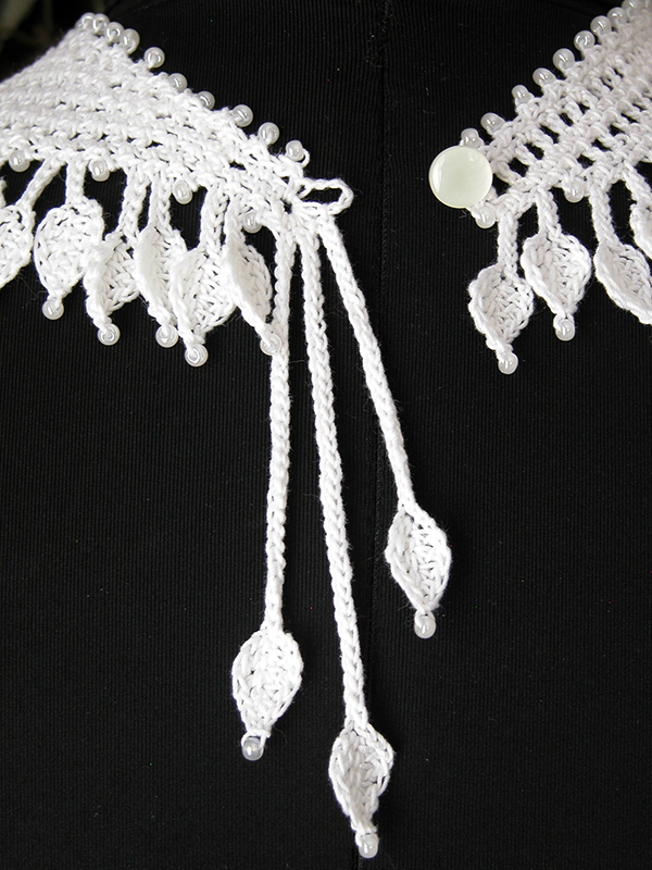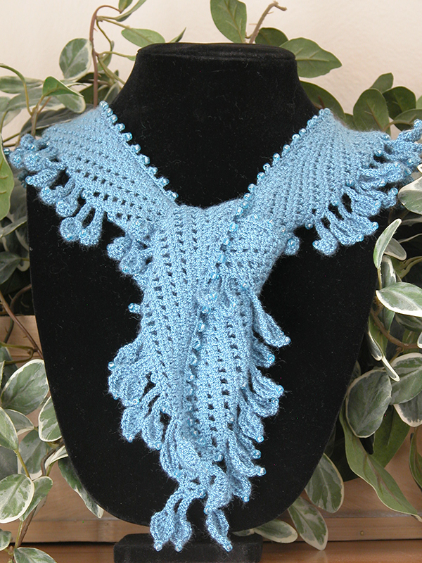 The choker was created with white crochet cotton, size 10, 6/0 seed beads, and a size 9 (1.40 mm) steel crochet hook. The scarflet was created using light blue crochet thread, size 5, 6/0 seed beads, and a size 1 (2.75 mm) steel crochet hook.