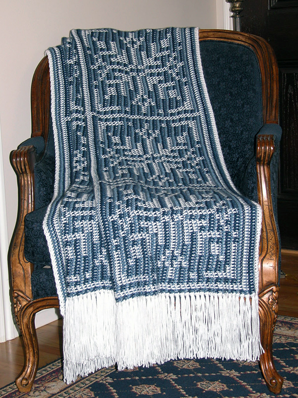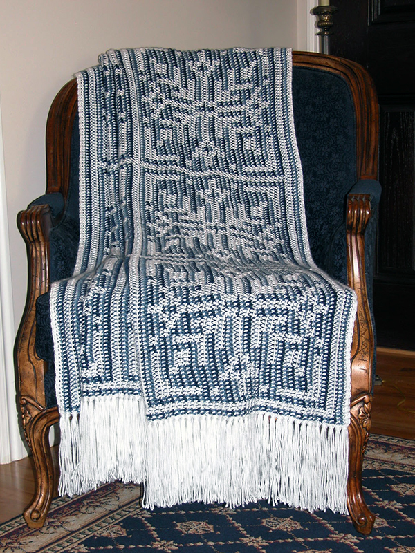 Keep warm in the winter with this beautiful afghan covered in giant snowflakes. A matching pillow is also included. This reversible technique makes one color more prominent on each side. It is not as complicated as it looks (check out the Free Patterns page for patterns to try out this technique)!