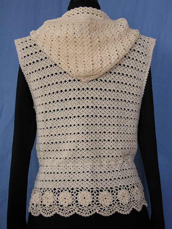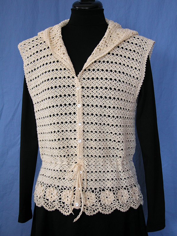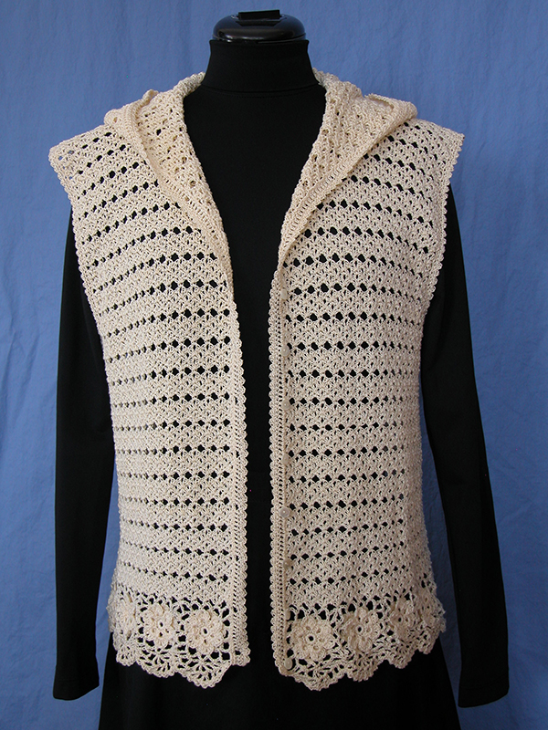Add this versatile hooded vest to any outfit to spruce up your wardrobe. The vest is worked from the bottom up beginning with join-as-you-go motifs and ending with a picot border around the hood and arms and a lacy border across the bottom. The vest buttons in the front, with a tie added at the waist, if desired.
