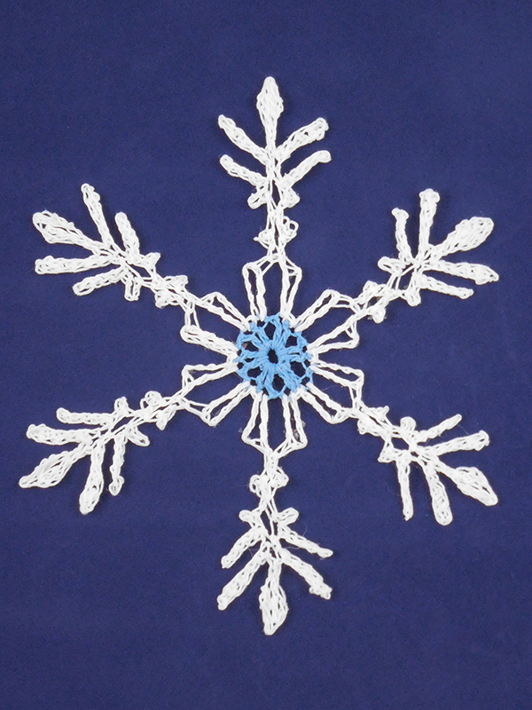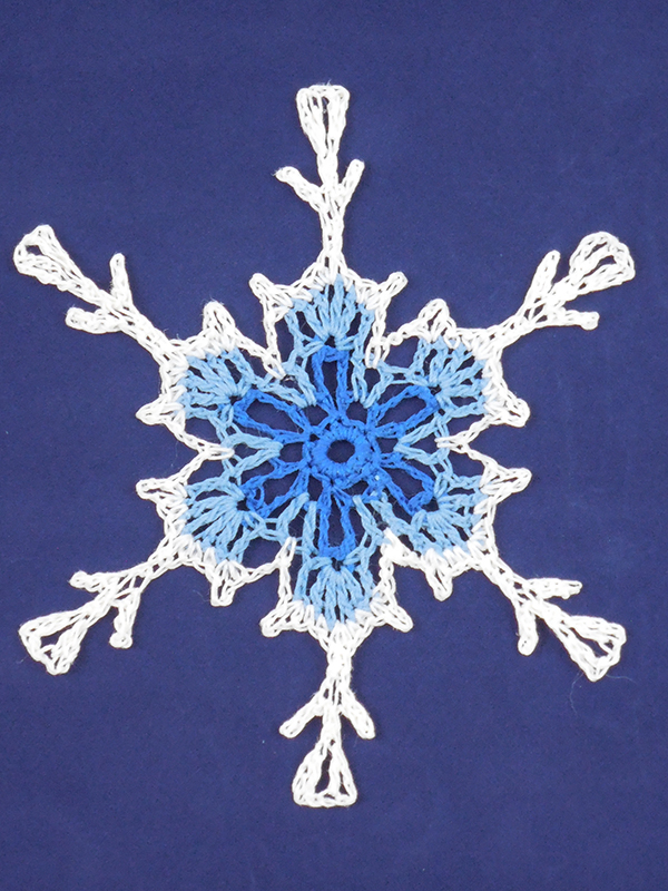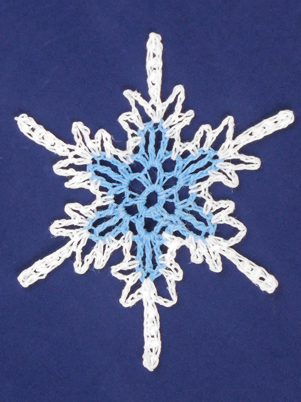 All snowflakes were created with white and two colors of blue crochet cotton, size 10, and a size 8 (1.50 mm) crochet hook.