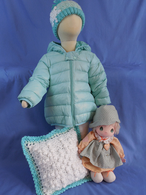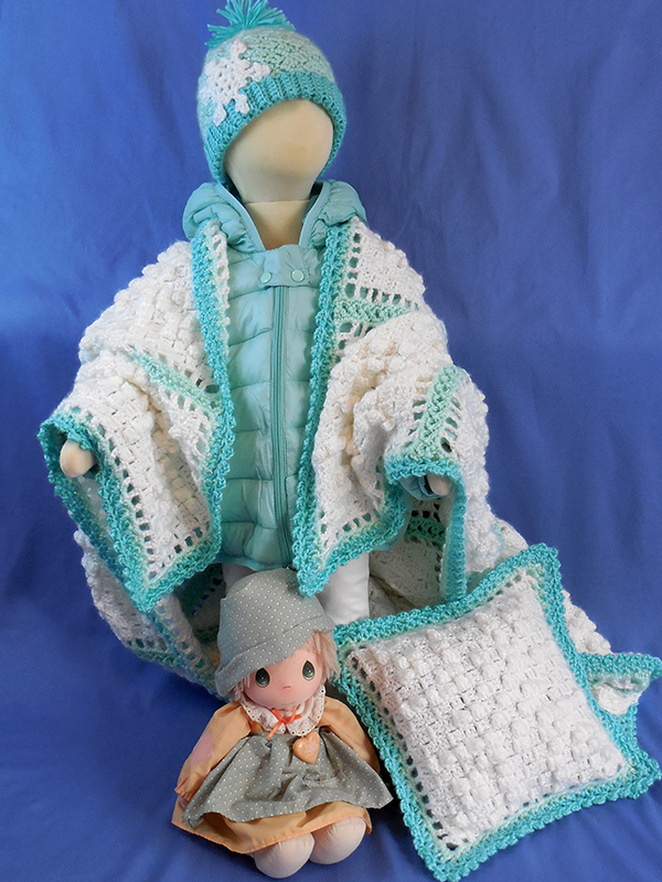 The afghan, pillow and baby hat were all created using soft worsted weight yarn and a size G (4.25mm) crochet hook. The American Girl hat was created using DK weight acrylic yarn and a size E (3.50 mm) crochet hook.