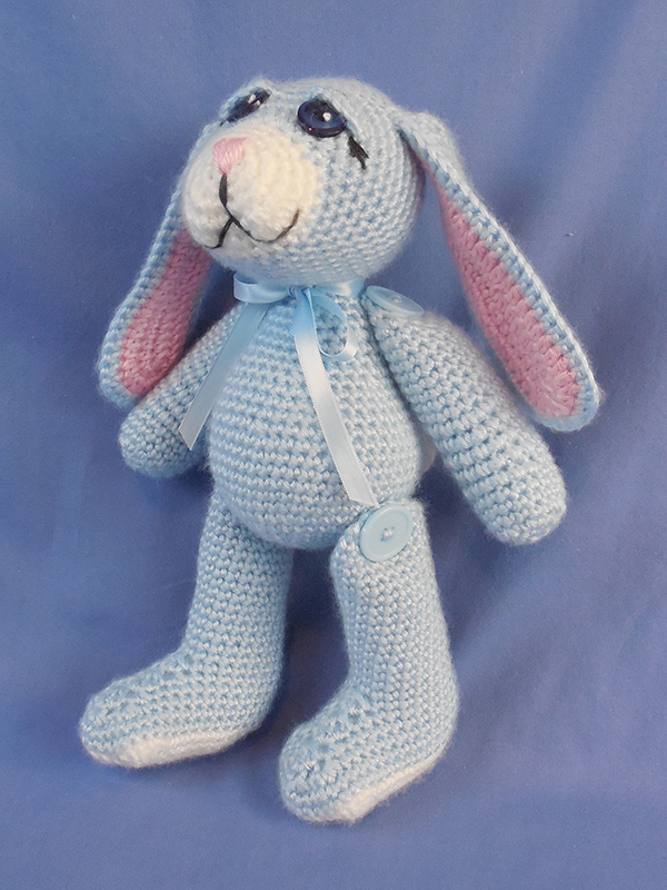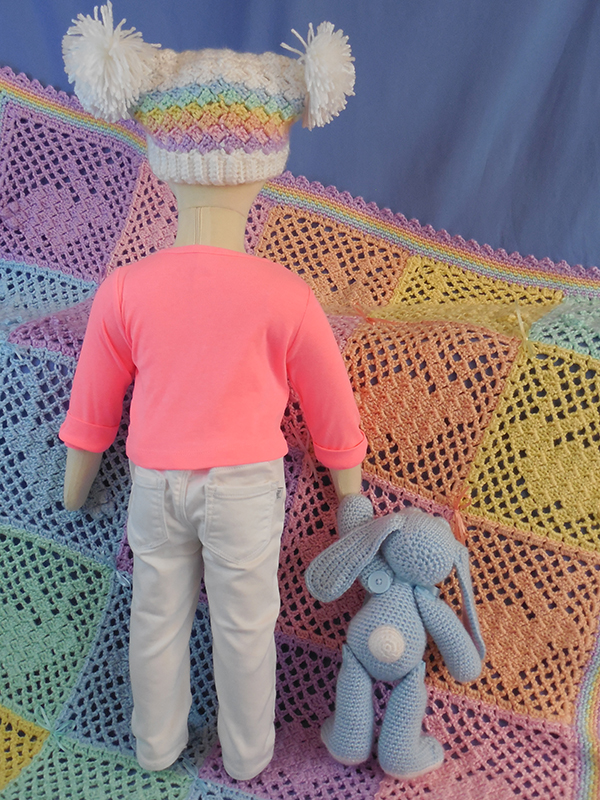 The afghan, bunny and baby hat were all created using soft worsted weight yarn and a size G (4.25mm) crochet hook. The American Girl hat was created using DK weight acrylic yarn and a size E (3.50 mm) crochet hook.