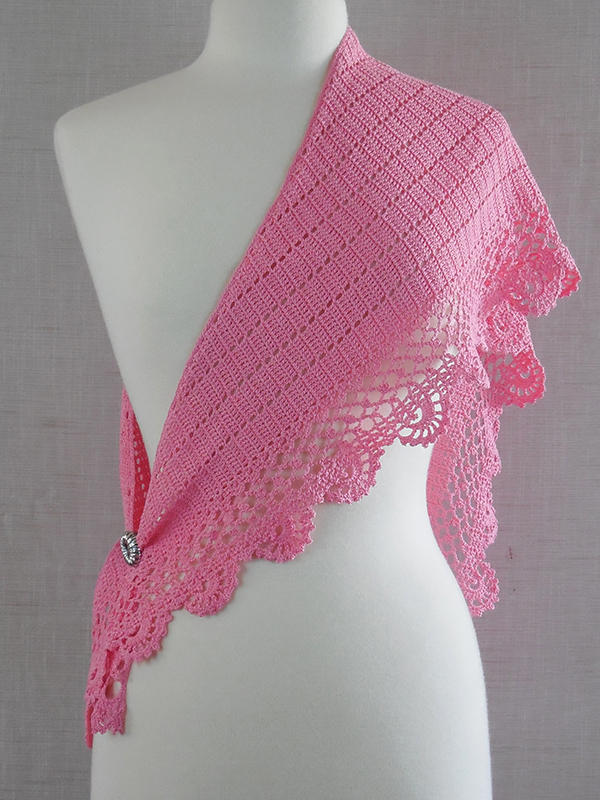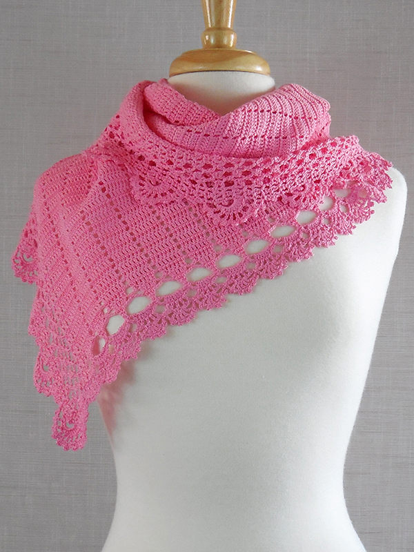 This lace-edged asymmetrical triangle shawlette is worked from the narrowest point increasing with each row. The curved border is reminiscent of nautilus shells!