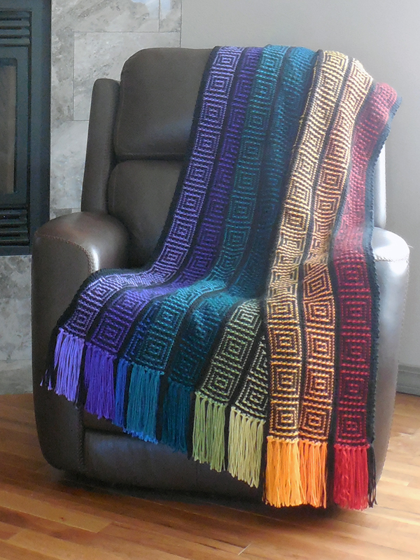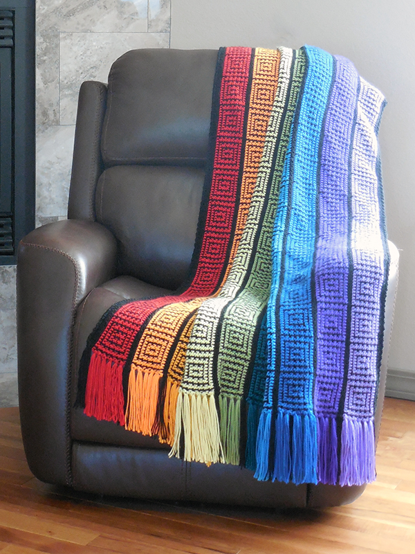 These brightly-colored reversible afghans will make your décor pop! The Rainbow Squares Afghan is worked in connect-as-you-go motifs; the Rainbow Stripes Afghan is worked in rows with the stripes extending into the fringe. This reversible technique alternates rows of black with twelve additional colors, from red to lavender, to create these colorful designs. It's not as complicated as it looks (check out the Free Patterns page for patterns to try out this technique)!