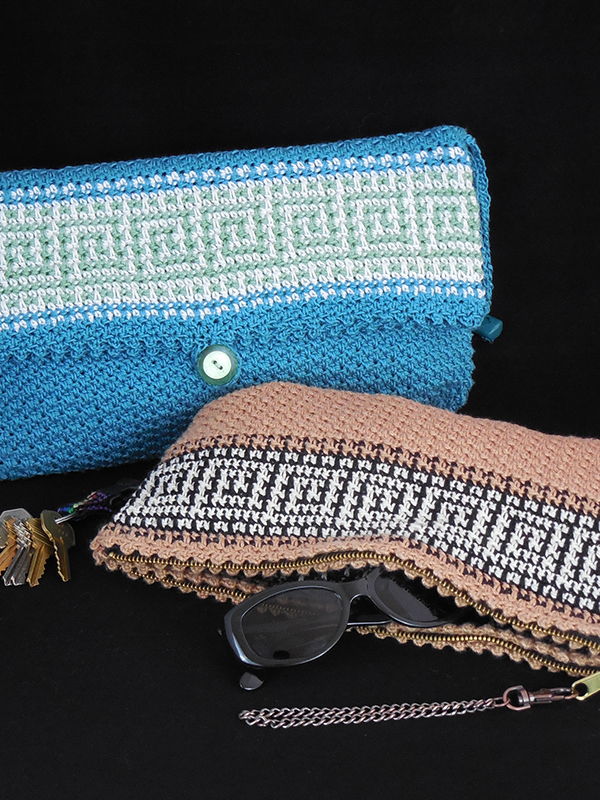 Both models were created using crochet cotton, size 3, and a size E (3.50 mm) crochet hook. Buttons and cord pulls are needed to complete the buttoned clutch; a 12" reversible zipper and pull chain are needed to complete the zippered clutch.