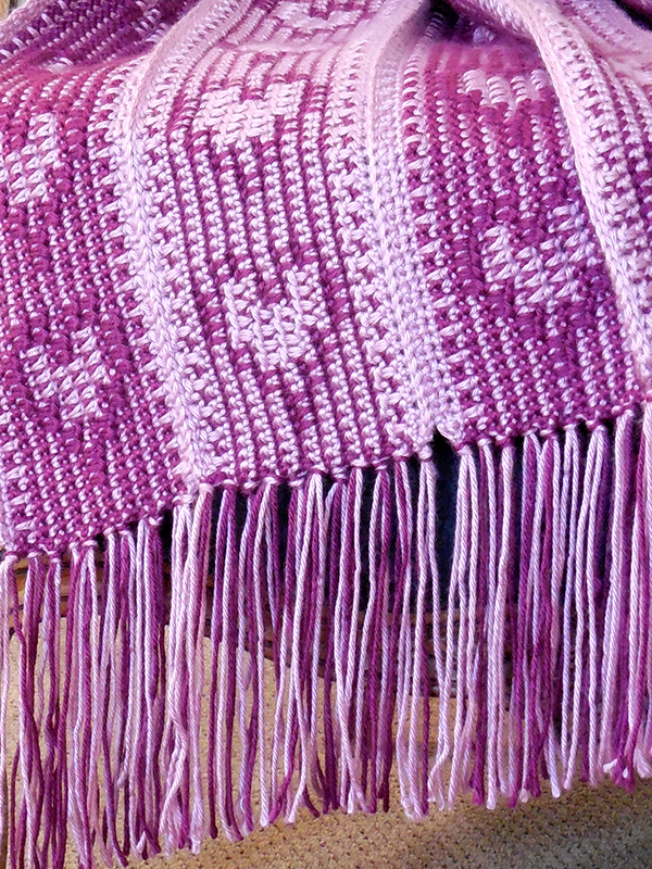 The model was created by alternating rows of light violet and magenta soft worsted weight yarn and using a size H (5.00 mm) crochet hook.