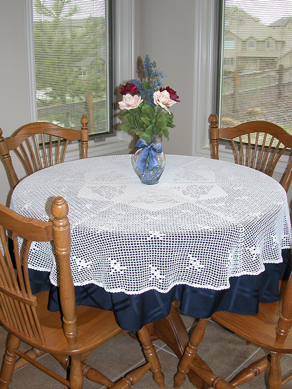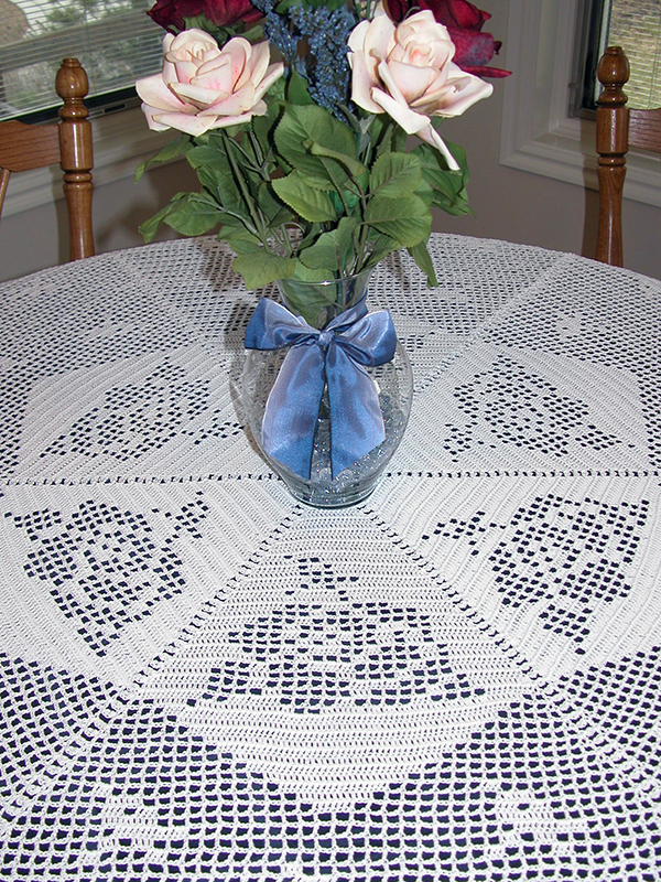 Large filet crochet roses and small rosebuds adorn this beautiful round table cover offered in three sizes to fit your table.