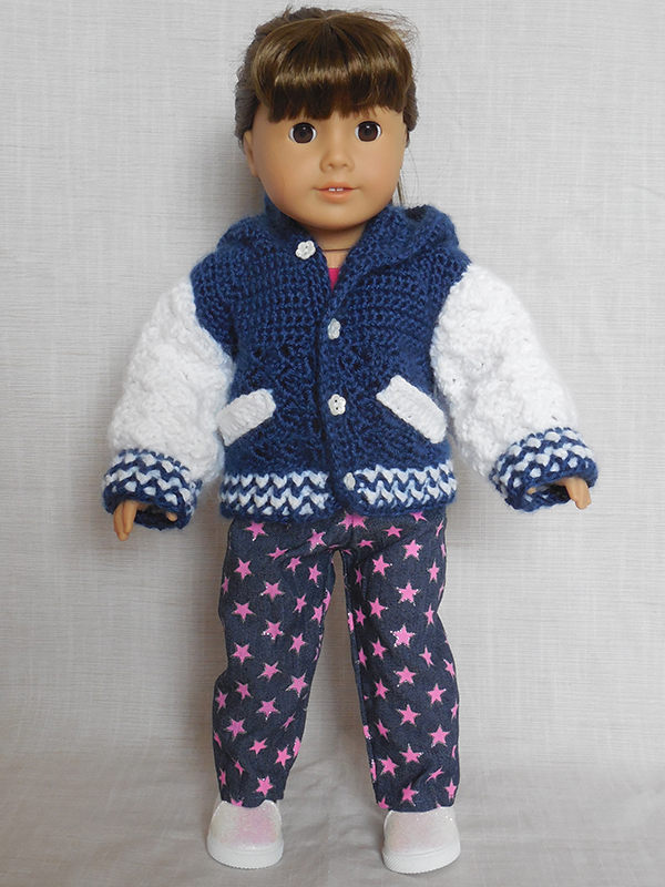 All models for size NB to 12 months were created using soft worsted weight yarn and size G (4.25 mm), H (5.00 mm), and F (3.75 mm) crochet hooks. The American Girl jacket was created using DK weight acrylic yarn and size E (3.50 mm) and F (3.75 mm) crochet hooks.