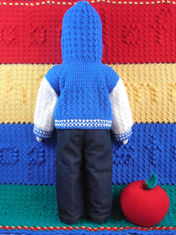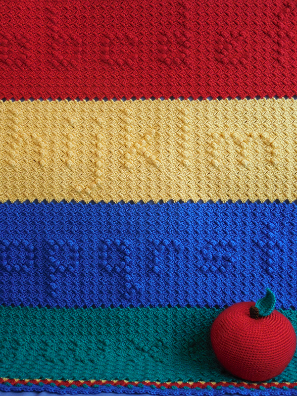 Get ready for school with this fun ABC's Afghan with popcorn alphabet and a cute apple border, the Hooded Letter Jacket sized for your newborn to 12 month old, and the Apple for the Teacher plushie. The afghan and jacket incorporate a corner-to-corner style technique to create the design. This set is ninth in a series of baby afghan sets using a hybrid of corner-to-corner and filet crochet techniques, with popcorn stitches added to enhance the design. Instructions are also included to make the Hooded Letter Jacket for your American Girl doll!