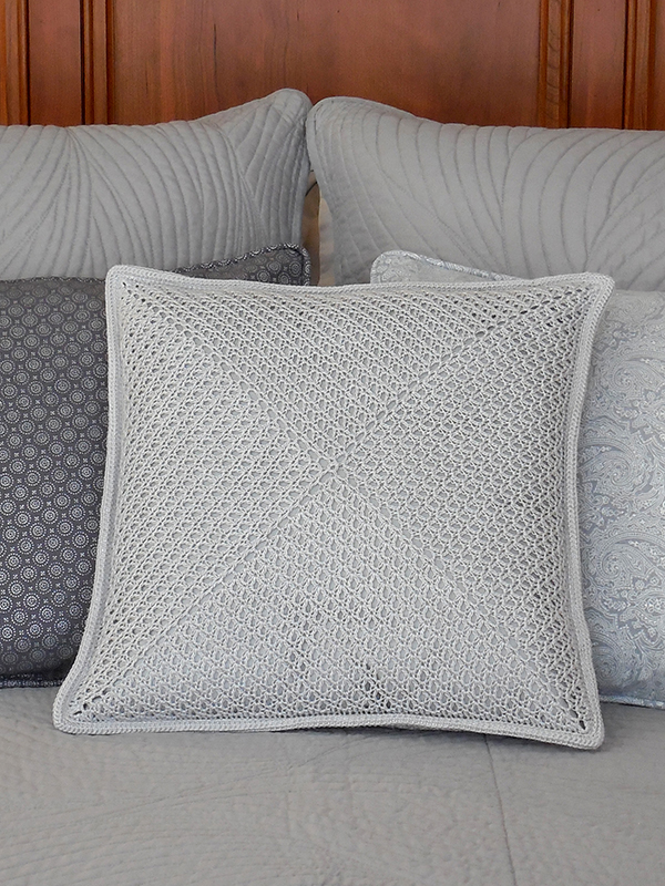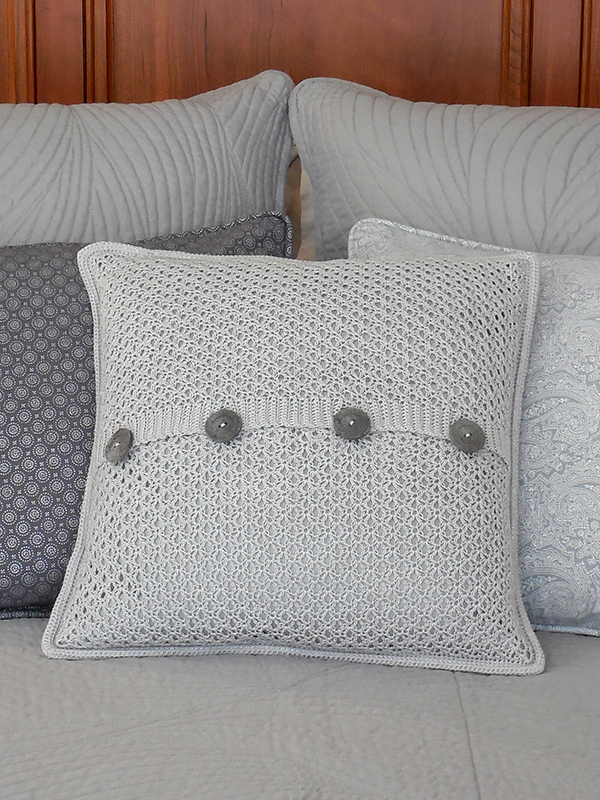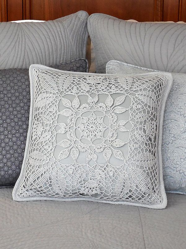 Relax in luxury with this sparkling Silver Leaf Pillow Set which includes a Lacy Leaf Pillow and Solid Pillow. Silver metallic sewing thread is combined with the crochet thread as an accent in the center of the Lacy Leaf Pillow and along the piping of both pillows. Both pillows button in back to easily insert a pillow form.