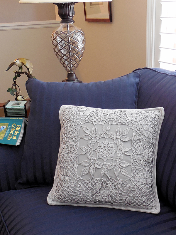 Both models were created with silver crochet thread, size 10, and a size 7 (1.65 mm) crochet hook. Metallic silver sewing thread is needed for accents, in addition to a 14" x 14" pillow form for each pillow.