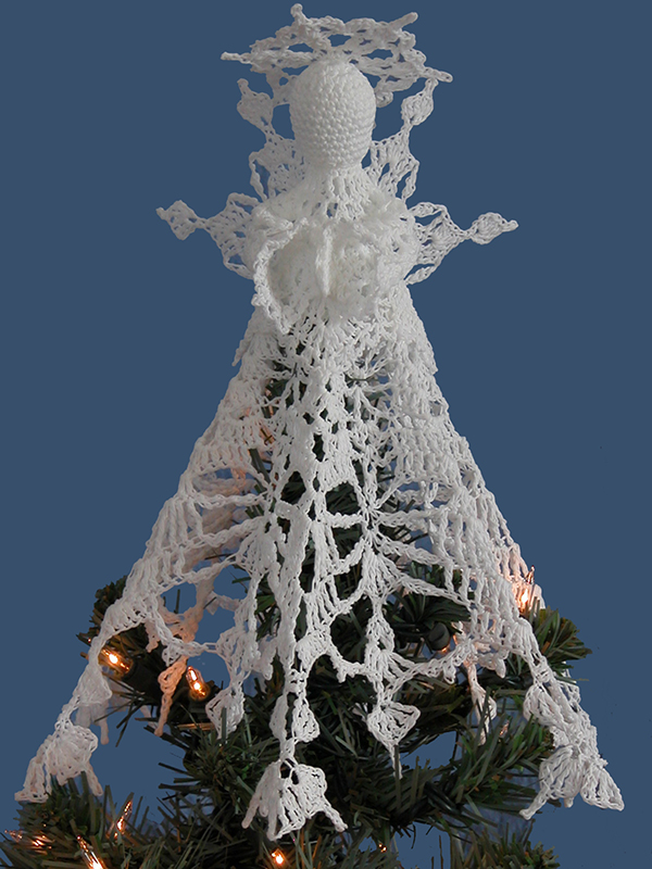 Adorn your tree with this delicate snowflake angel tree topper. The wings and halo are made with snowflakes, and the skirt is created with a coordinating snowflake-like design. Instructions to make a table stand are also provided.