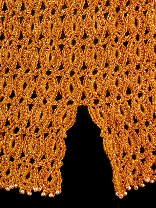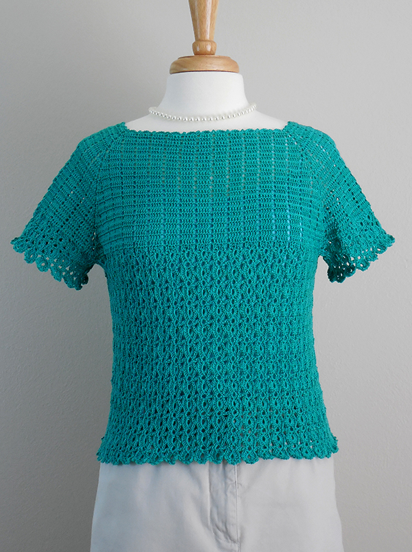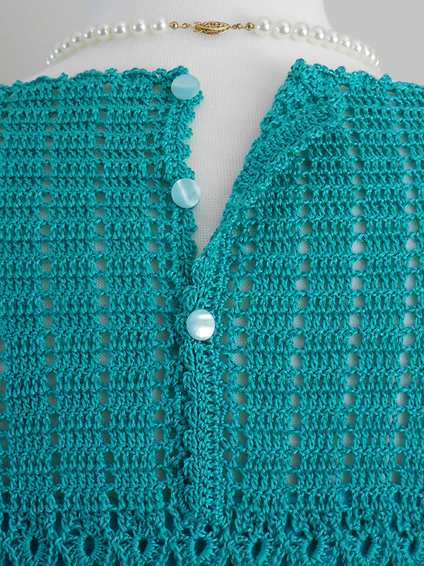 The Spring Breeze top was created with jade crochet thread, size 10; and the Fall Shimmer top was created with copper/copper metallic crochet thread, size 10. A size 7 (1.65mm) steel crochet hook was used for both tops. Additional materials include: 1/2" round buttons for the back closure; 6/0 seed beads for the bottom border of the Fall Shimmer top.