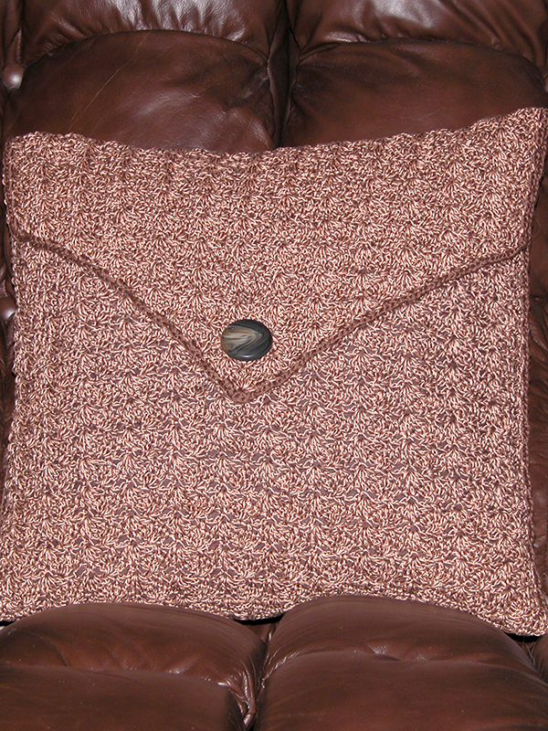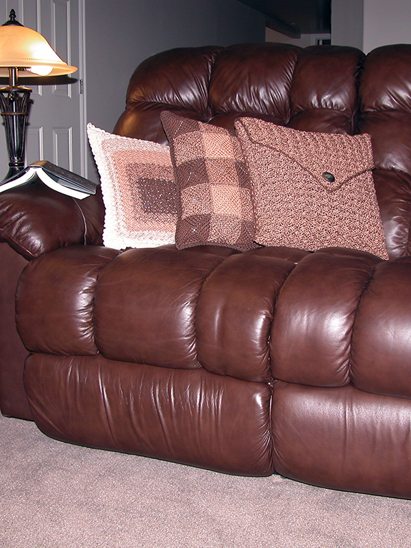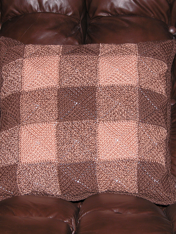 Three pillow designs (Diamond, Gingham and Button) are provided using different combinations of the same three colors: light ecru, light copper and brown.