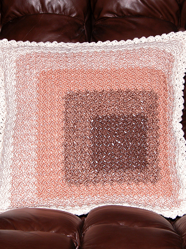 All models were created using two strands of cotton crochet thread, size 10, held together and a size D (3.25 mm), E (3.50 mm), or F (3.75 mm) crochet hook. A 16" square pillow form is also needed for each pillow.