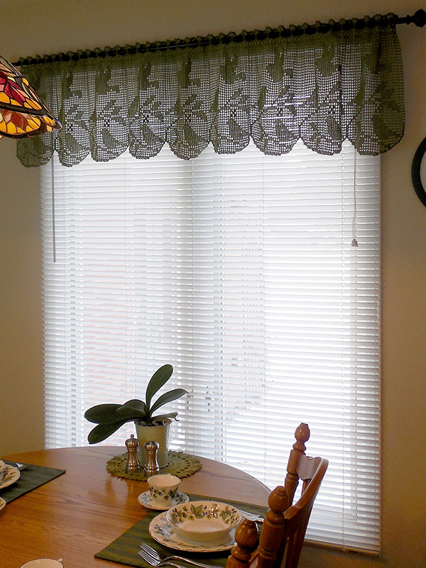 This delightful valance is covered with whimsical birds sitting on branches and flying through the air. A slight gathering at the top of the valance is incorporated into the pattern. The rod pocket is also built into the design to fit a 5/8” or 3/4” inch curtain rod. The valance is shown on a 56" wide window.