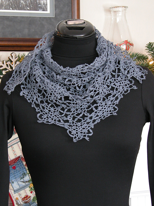 Add this elegant shawlette to your wardrobe to bring winter charm to any outfit. The wool and stainless steel yarn gives added body to the snowflake motifs connected using a join-as-you-go technique.