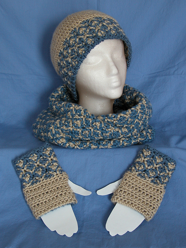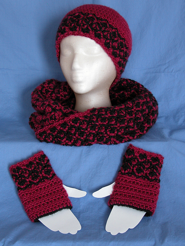 Keep extra warm in cold weather with these reversible crochet neck warmers, hats and wrist warmers. The versatile neck warmers can be worn around the neck or pulled up over the head as a hood. The hat and wrist warmers are double thickness, making them both reversible and extremely warm. All were crocheted in the round so there is no need for sewing; the twisted neck warmer is even crocheted with the twist in it! This reversible technique makes one color more prominent on each side. It is not as complicated as it looks (check out the Free Patterns page for patterns to try out this technique)!