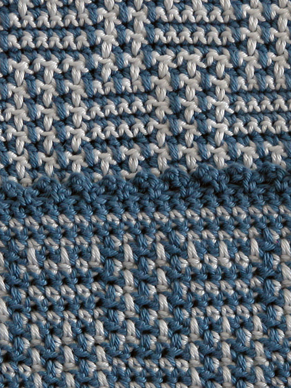 The models were created by alternating rows of medium blue and light brown cotton crochet thread, size 10 (with two strands held together), and using a size D (3.25 mm) crochet hook.