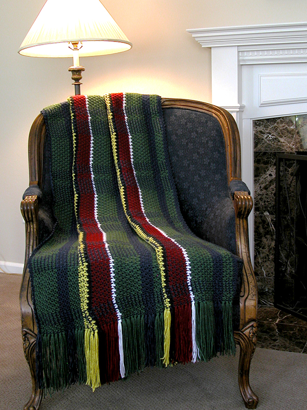 Warm up your holidays with the bright Christmas colors of this reversible afghan. This reversible technique alternates rows of blue with green, red, white, black and yellow to create this plaid design. It's not as complicated as it looks (check out the Free Patterns page for patterns to try out this technique)!