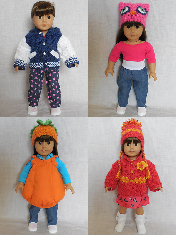 Accessorize your American Girl Doll all year long with these fun hats and accessories! This set includes a hat or hooded jacket themed for each month of the year. In addition, a jumper, galoshes, fishing vest, cardigan, holiday outfit and a second hat for October are also included in this pattern set.
