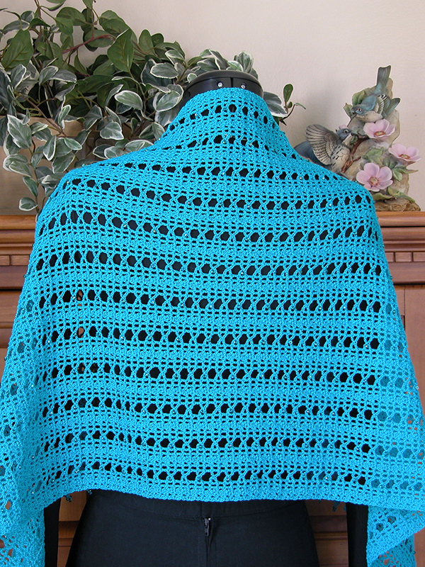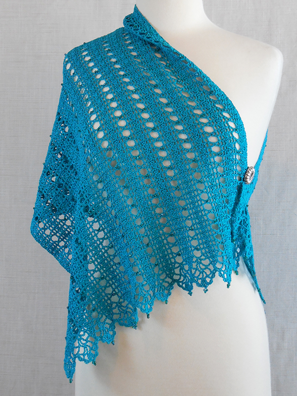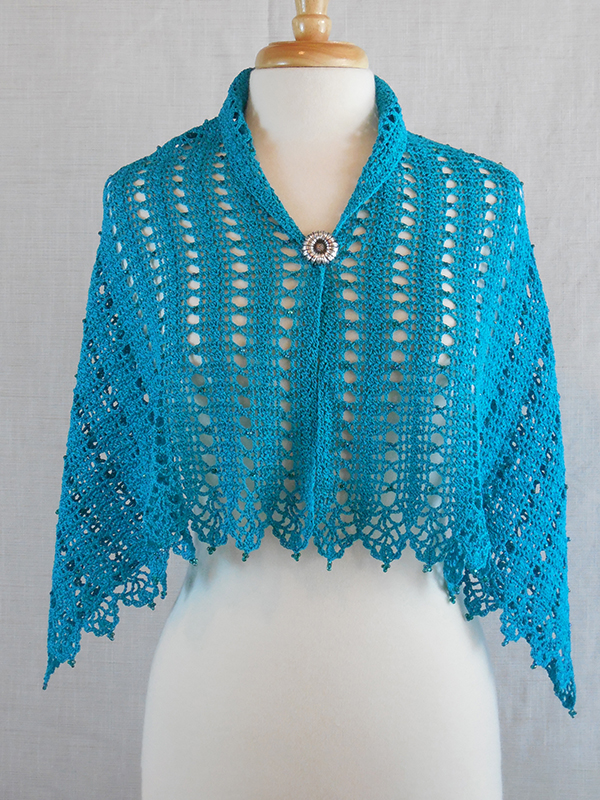 The model was created with teal crochet cotton, size 10, and a size 7 (1.65 mm) steel crochet hook. Teal 6/0 seed beads are incorporated throughout the shawl.
