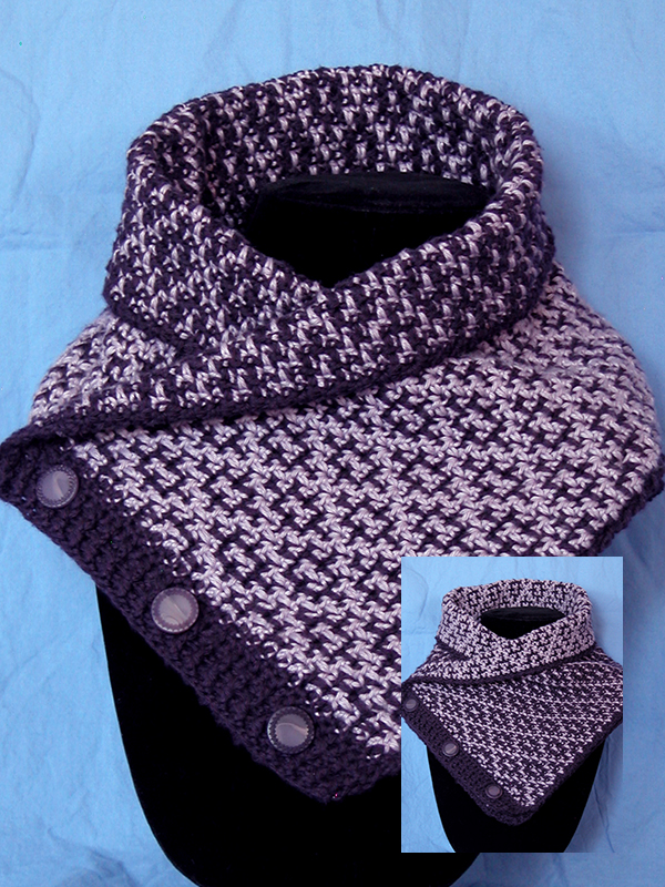 Keep extra warm in cold weather with the reversible buttoned neck warmer, hat and ear warmer. The versatile neck warmer and ear warmer can be buttoned on either side for a different look. The crown of the hat is double thickness, making it both reversible and extremely warm. The unique reversible design makes one color more prominent on each side. It is not as complicated as it looks (check out the Free Patterns page for patterns to try out this technique)!
