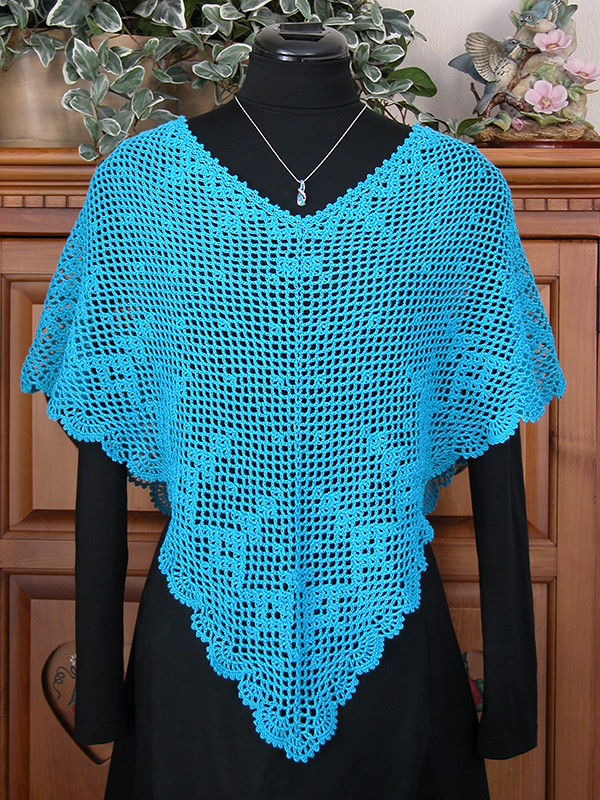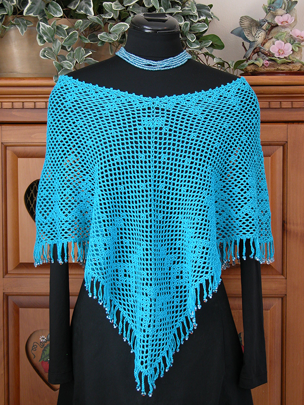 This versatile cape makes a great coverup for a summer outfit or adds a touch of color to a winter outfit. It can be worn as a traditional poncho or even turned and worn sideways. Two border styles, a lacy scalloped border and a beaded fringe border, are provided to create different looks. Instructions are also provided for a smaller neck opening, if desired, and detailed graphs are included for reference.