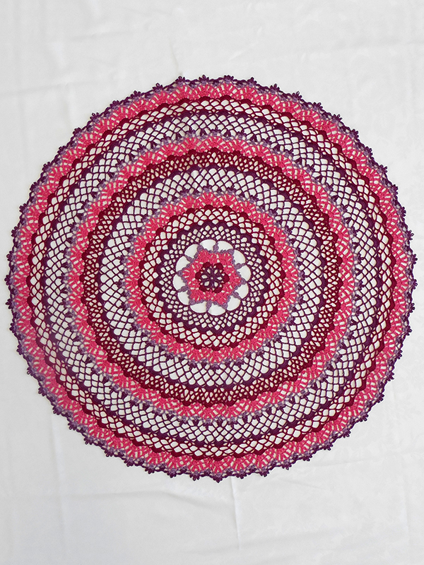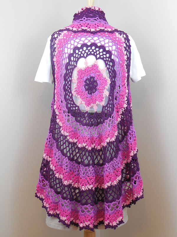 Concentric lacey patterns create this fun boho-style circle vest. The various sizes are established on the armhole opening round and three different lacy borders are included to change the final diameter of the vest. Instructions are also provided to create a lacy doily by eliminating the armholes.