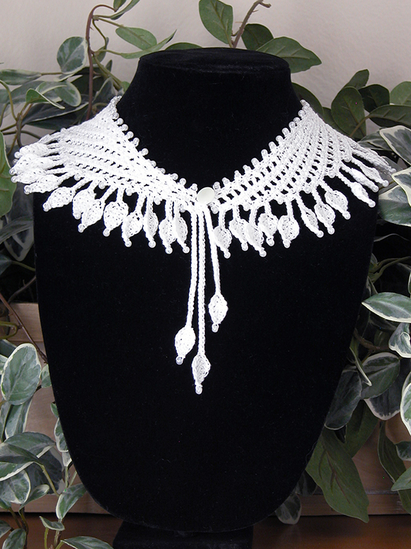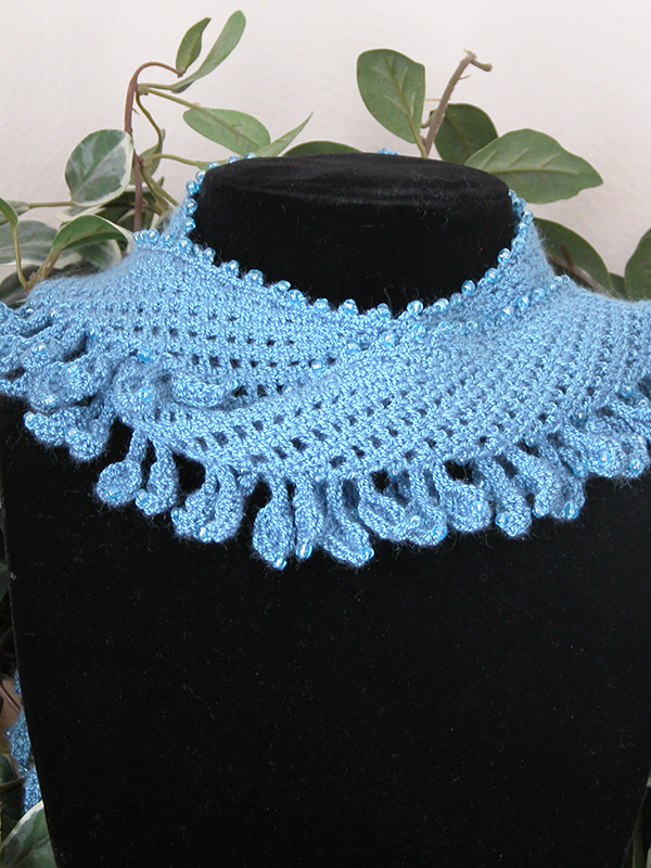 The choker was created with white crochet cotton, size 10, 6/0 seed beads, and a size 9 (1.40 mm) steel crochet hook. The scarflet was created using light blue crochet thread, size 5, 6/0 seed beads, and a size 1 (2.75 mm) steel crochet hook.
