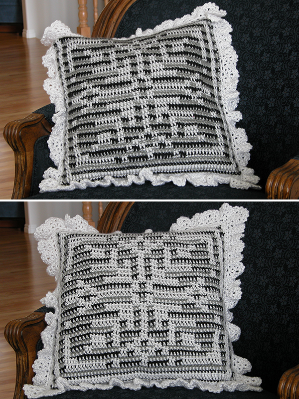 All models were created by alternating rows of white with two shades of blue or grey soft worsted weight yarn and using a size H (5.00 mm) crochet hook. An 18" square pillow form is needed for the pillow.