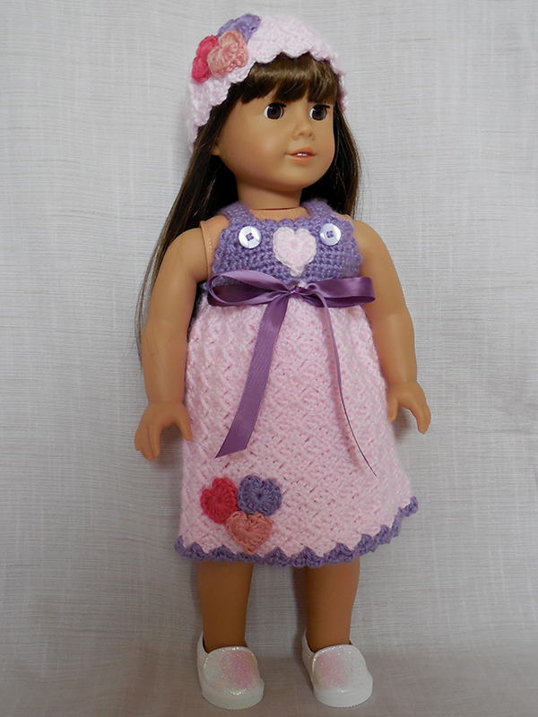 All models for size NB to 12 months were created using soft worsted weight yarn and a size G (4.25mm) crochet hook. The American Girl doll outfit was created using DK weight acrylic yarn and sizes E (3.50 mm) and D (3.00 mm) crochet hooks.
