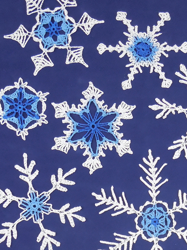 All snowflakes were created with white and two colors of blue crochet cotton, size 10, and a size 8 (1.50 mm) crochet hook.