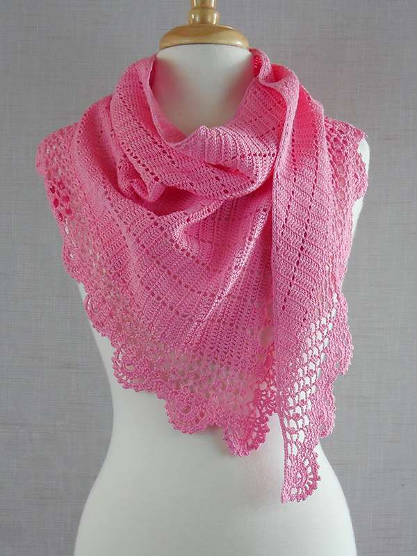 This lace-edged asymmetrical triangle shawlette is worked from the narrowest point increasing with each row. The curved border is reminiscent of nautilus shells!