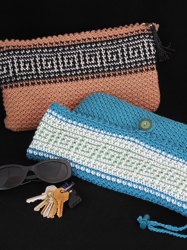 Both models were created using crochet cotton, size 3, and a size E (3.50 mm) crochet hook. Buttons and cord pulls are needed to complete the buttoned clutch; a 12" reversible zipper and pull chain are needed to complete the zippered clutch.