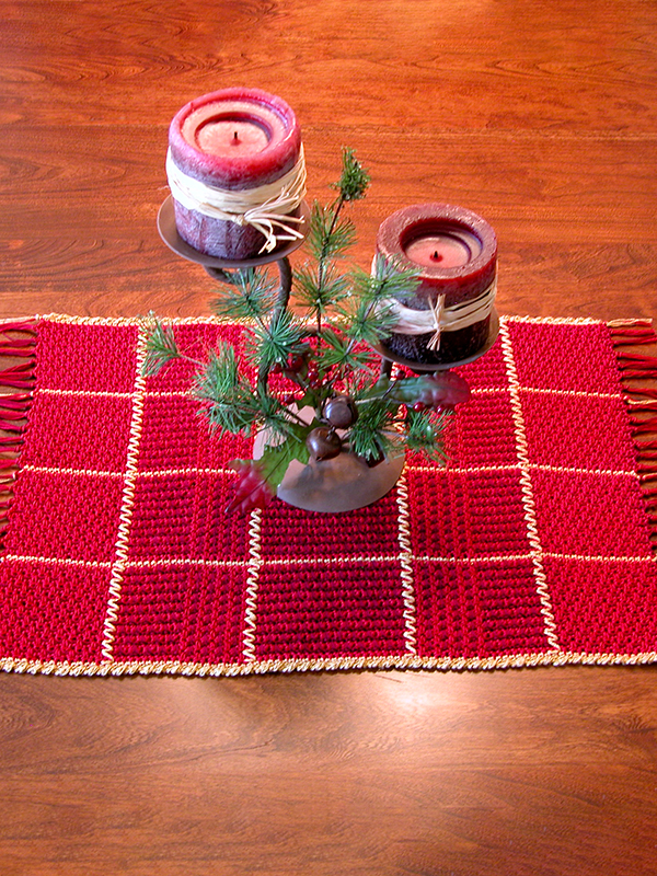 Make these versatile placemats in any color to match your décor. They can be used as individual placemats or as a table centerpiece. The reversible plaid effect is created by alternating rows of a light and dark tone of the same color. The four horizontal sections are separated by a metallic thread row. The vertical accents are embroidered on the finished piece. This reversible technique is not as complicated as it looks (check out the Free Patterns page for patterns to try out it out)!