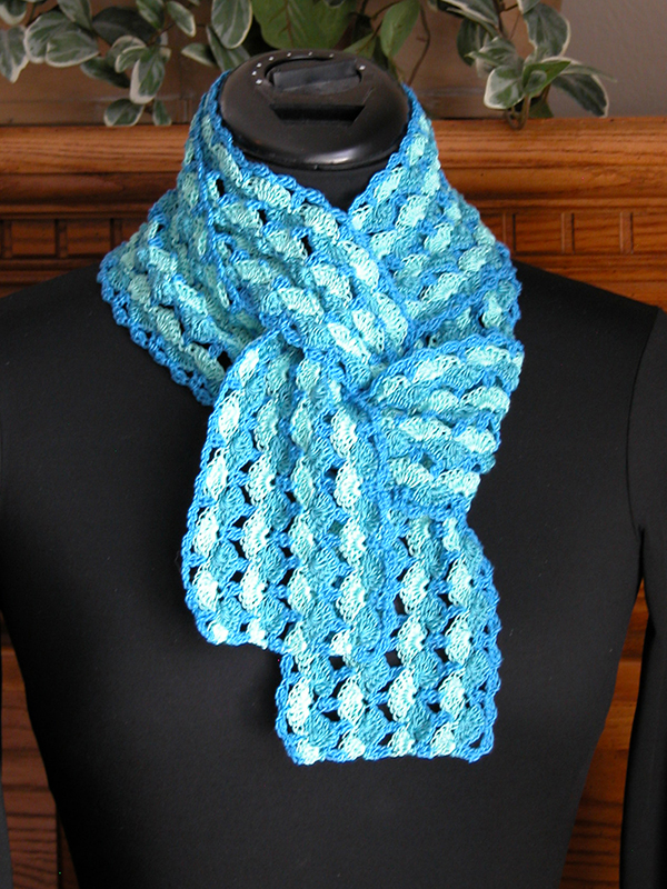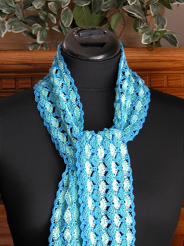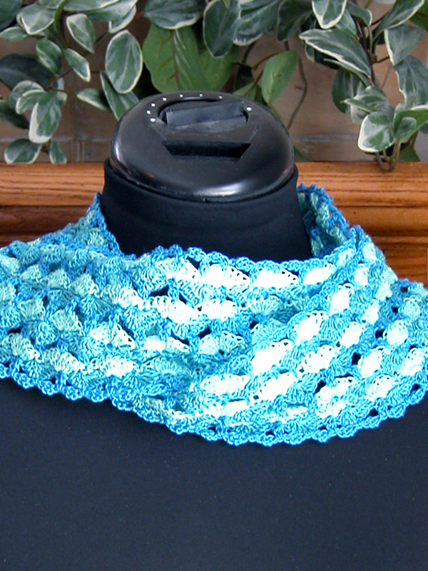 Quickly make up this light and airy thread crochet scarf in waves of blue to dress up your summer outfits!