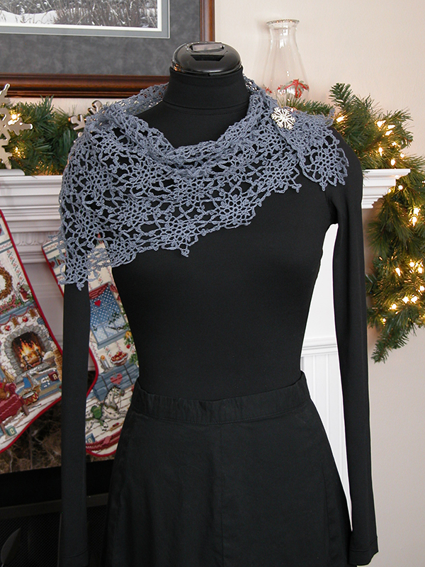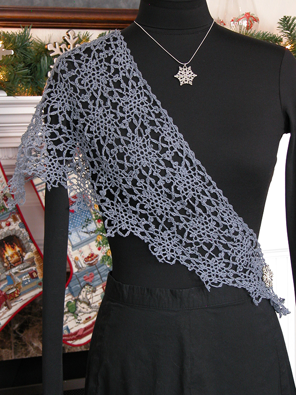 Add this elegant shawlette to your wardrobe to bring winter charm to any outfit. The wool and stainless steel yarn gives added body to the snowflake motifs connected using a join-as-you-go technique.