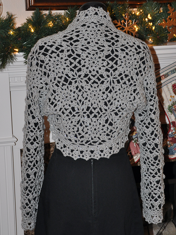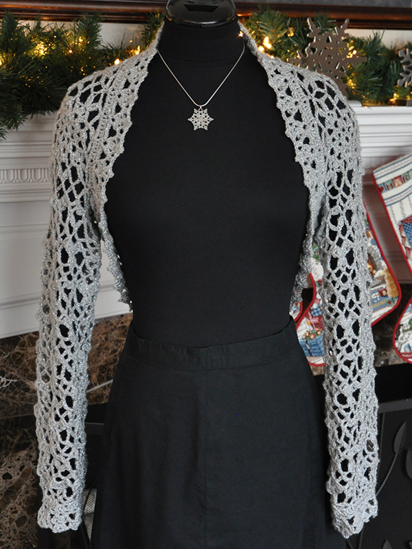 Add sparkle to your outfit with this shimmery shrug connecting snowflake-like motifs using a join-as-you go method. Instructions are given to determine your own size. Options are also included for two different cuff styles or a sleeveless option.