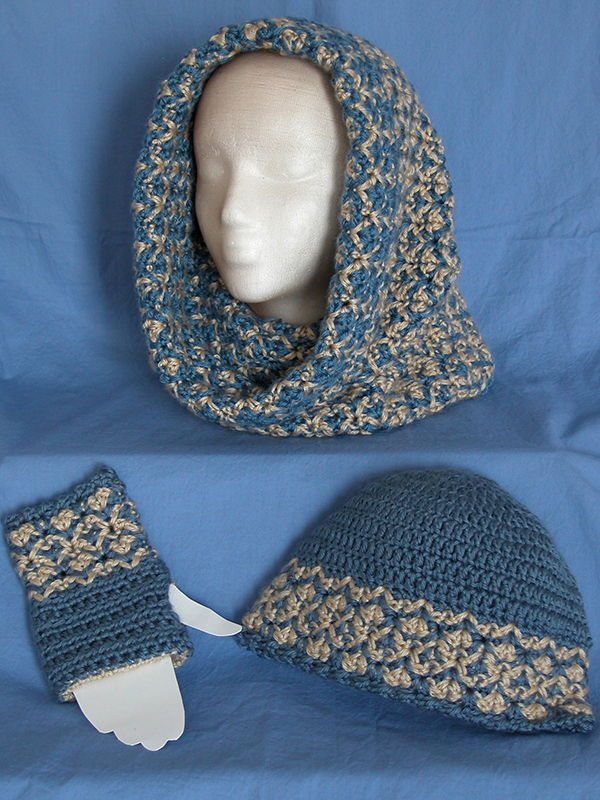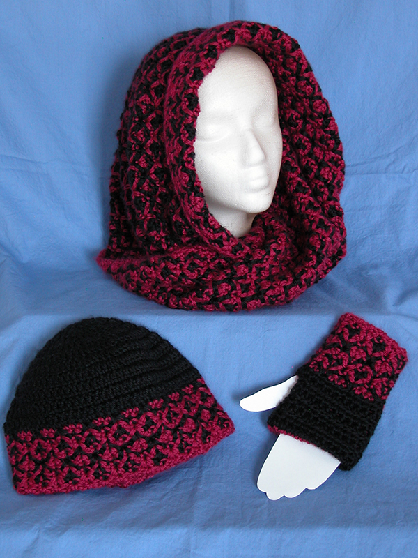 Keep extra warm in cold weather with these reversible crochet neck warmers, hats and wrist warmers. The versatile neck warmers can be worn around the neck or pulled up over the head as a hood. The hat and wrist warmers are double thickness, making them both reversible and extremely warm. All were crocheted in the round so there is no need for sewing; the twisted neck warmer is even crocheted with the twist in it! This reversible technique makes one color more prominent on each side. It is not as complicated as it looks (check out the Free Patterns page for patterns to try out this technique)!